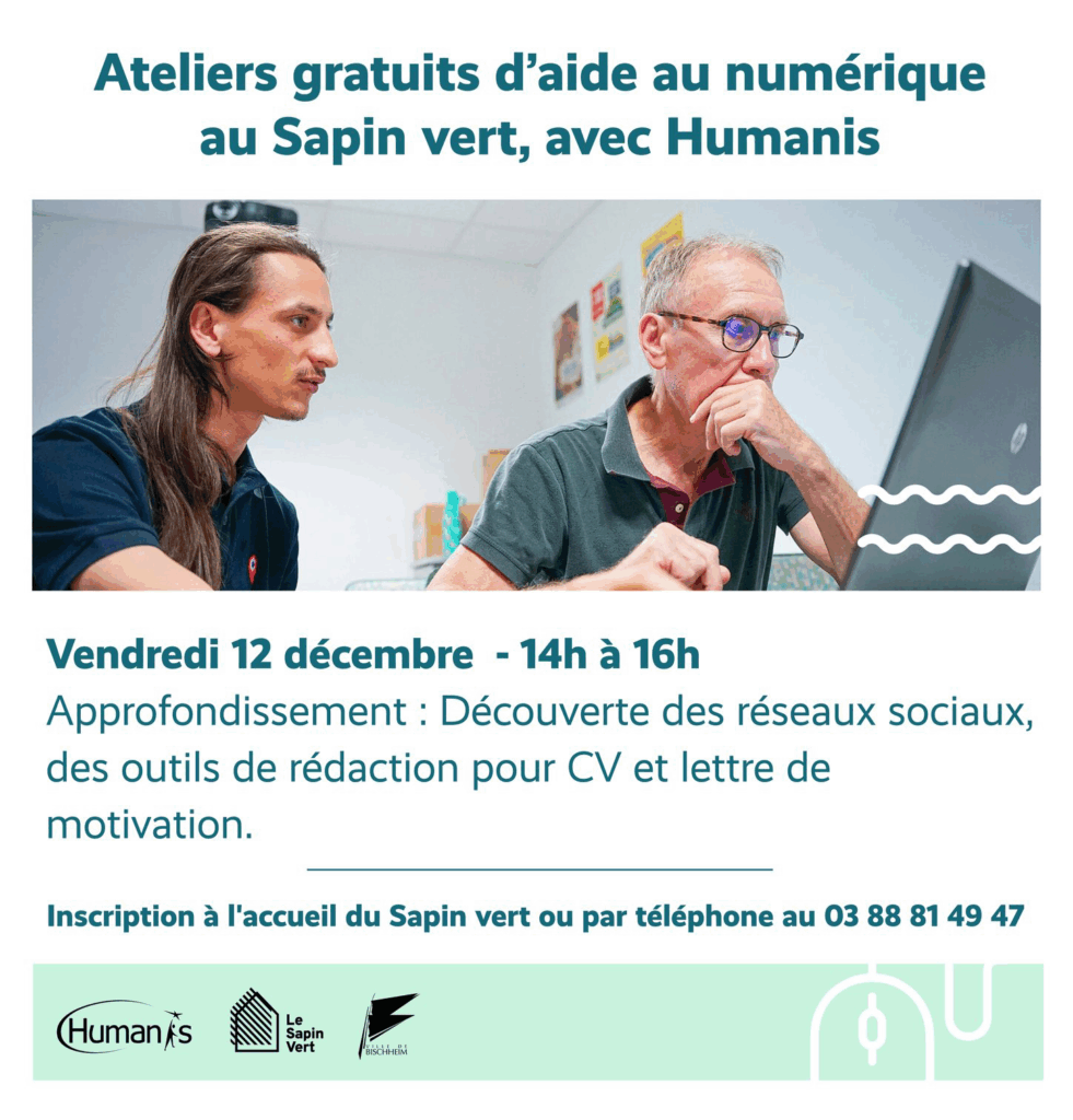 Le Sapin Vert et le collectif HUMANIS vous invitent à un atelier gratuit d’approfondissement, consacré à la découverte des réseaux sociaux et à l’utilisation d’outils de rédaction pour créer un CV ou une lettre de motivation 💻